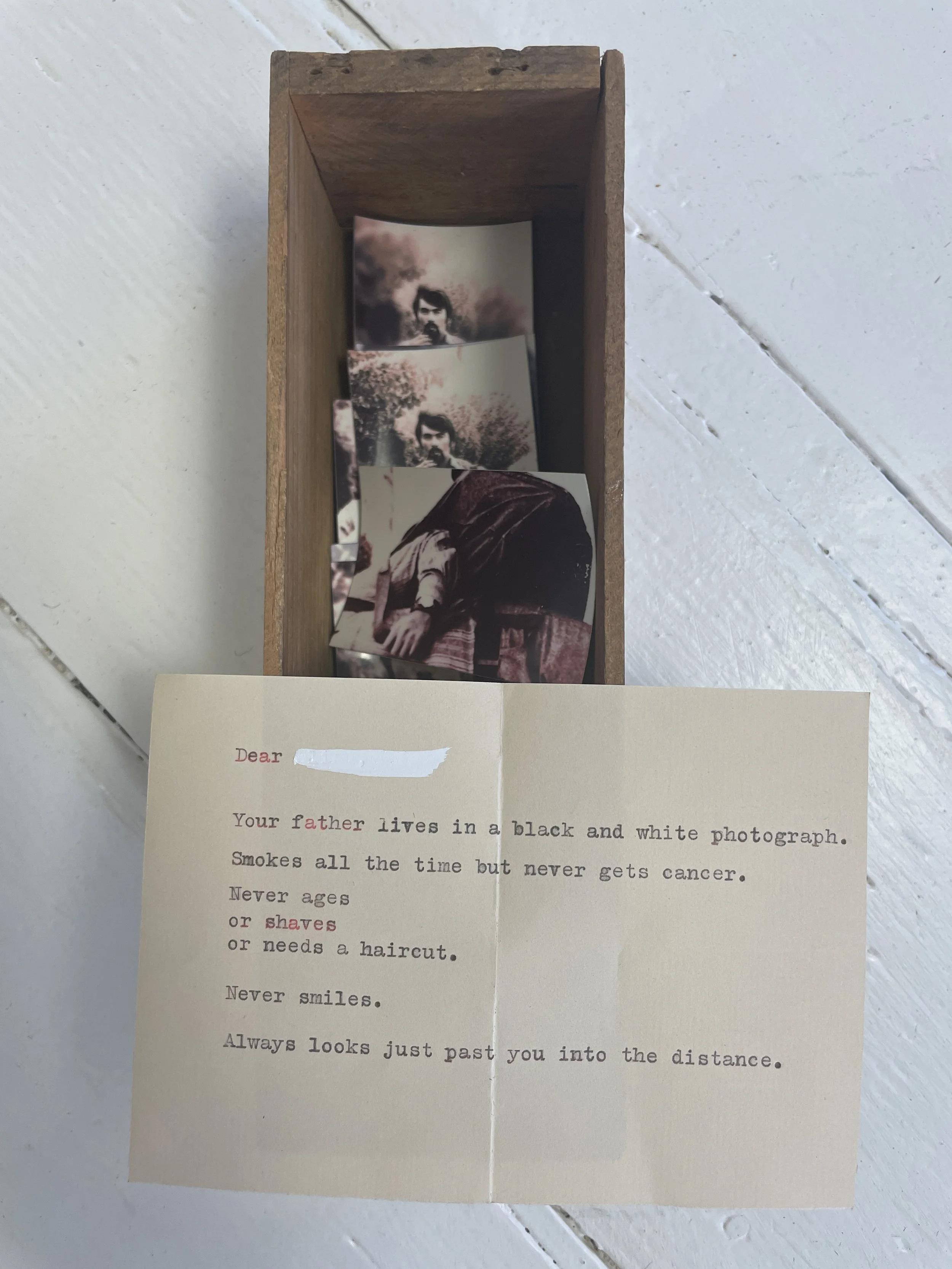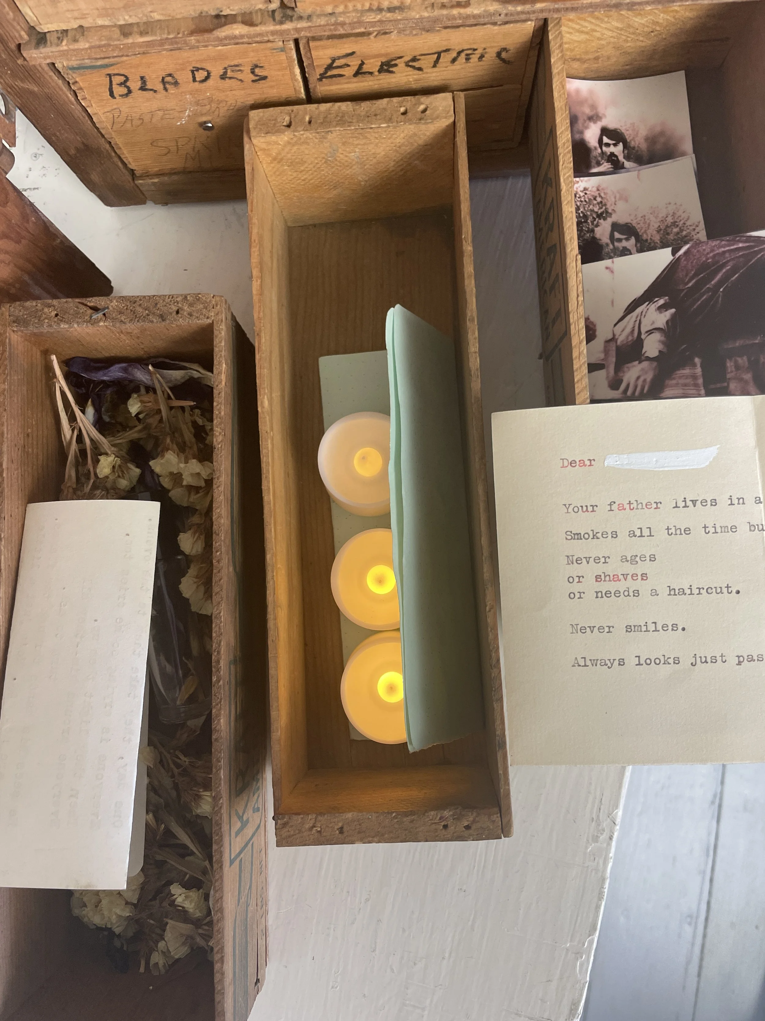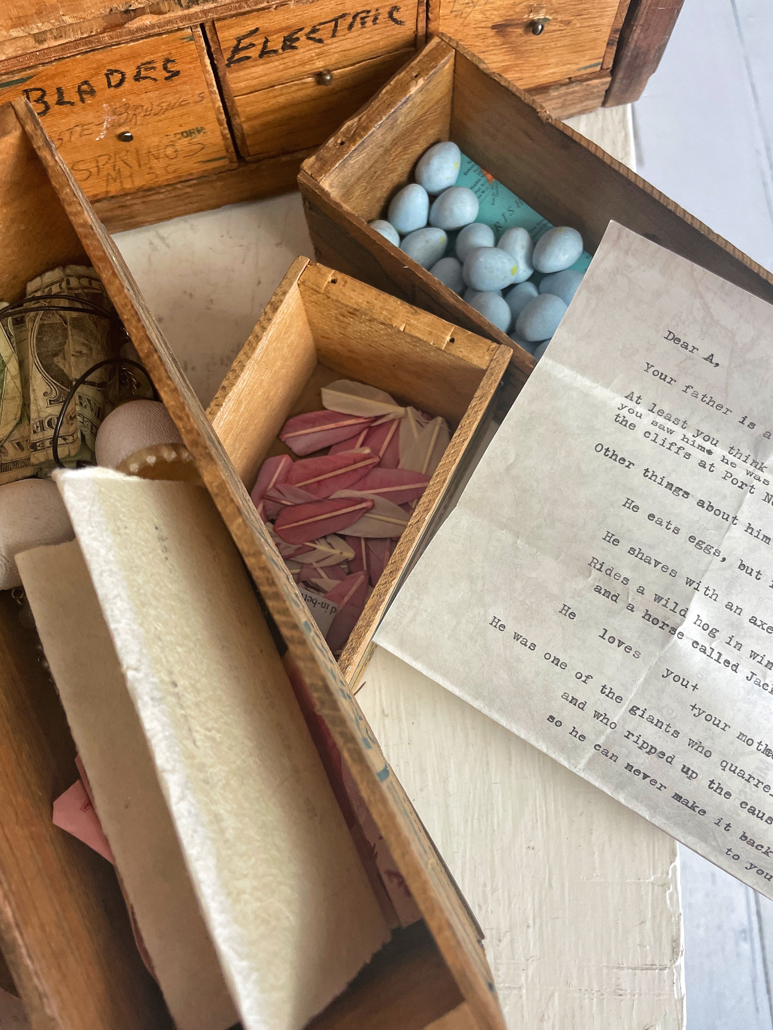 Materials: Primitive tool box Americana circa 1920s, flowers and other organic matter, paper, ink, candy, rocks, a fishing hook, rope, sugar, tea, and feathers.