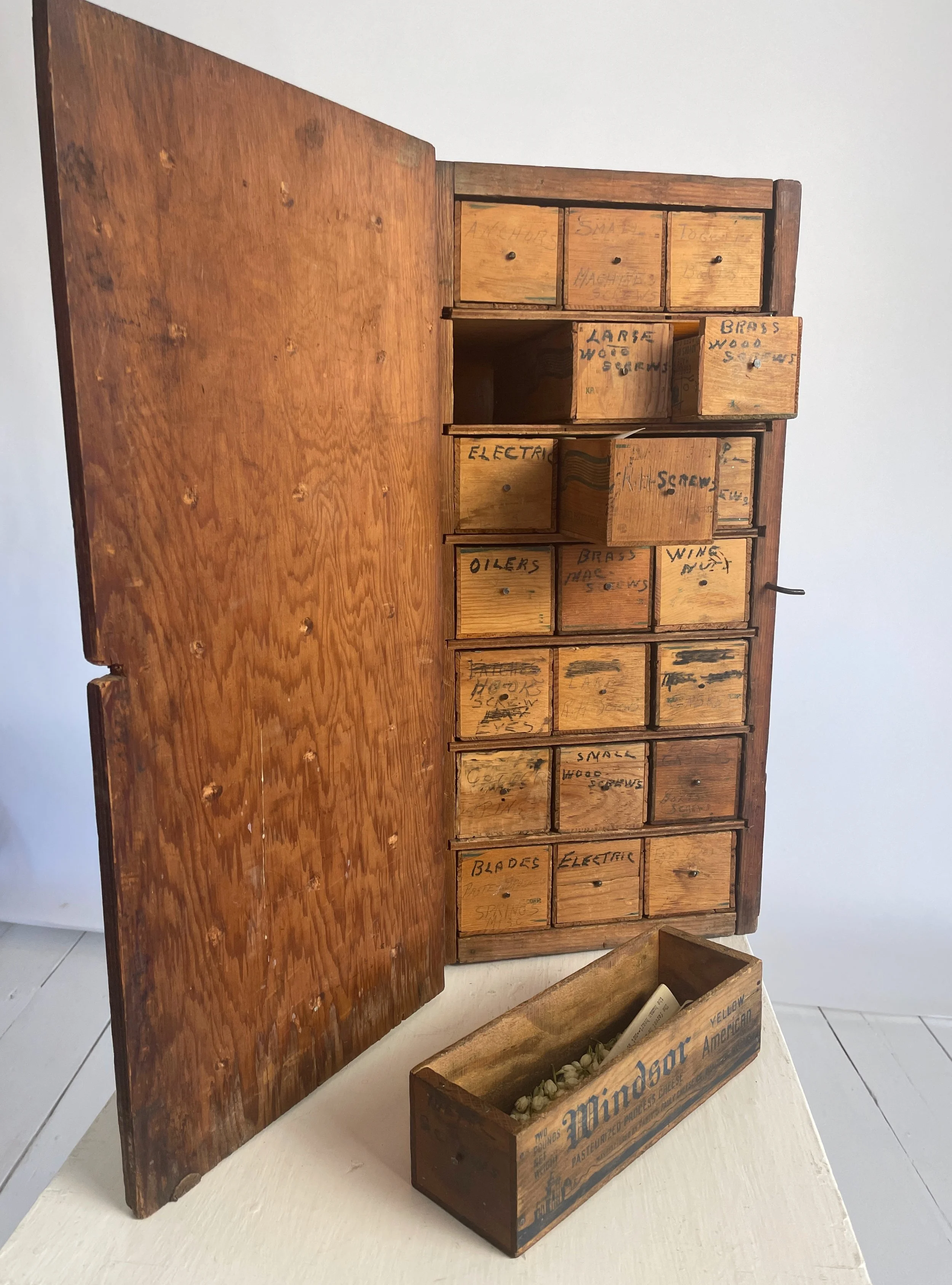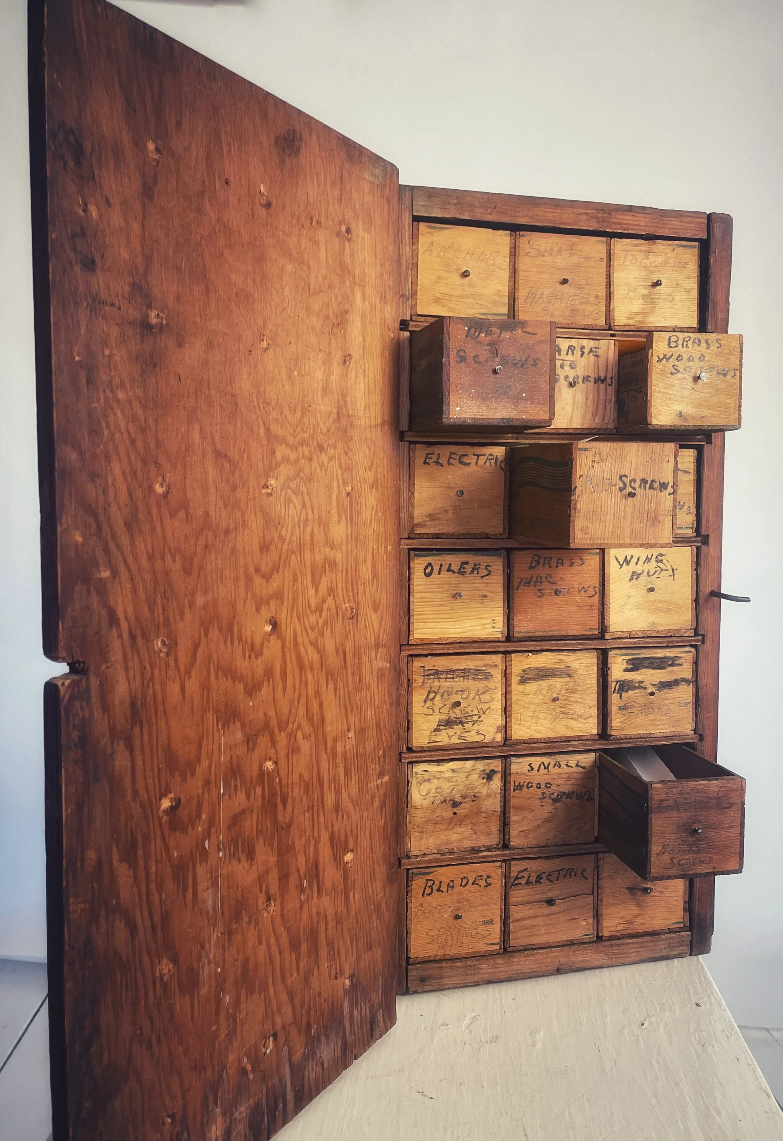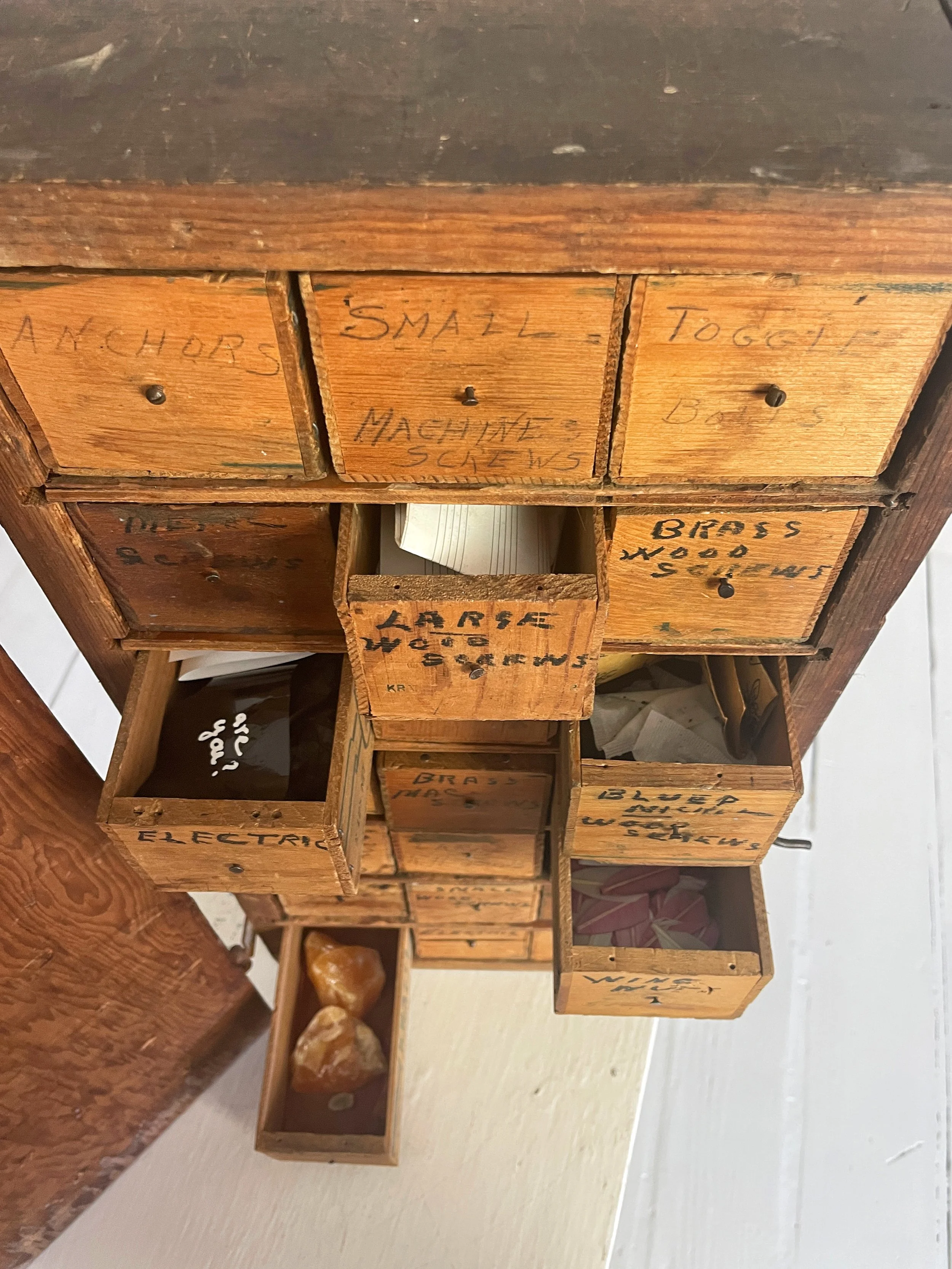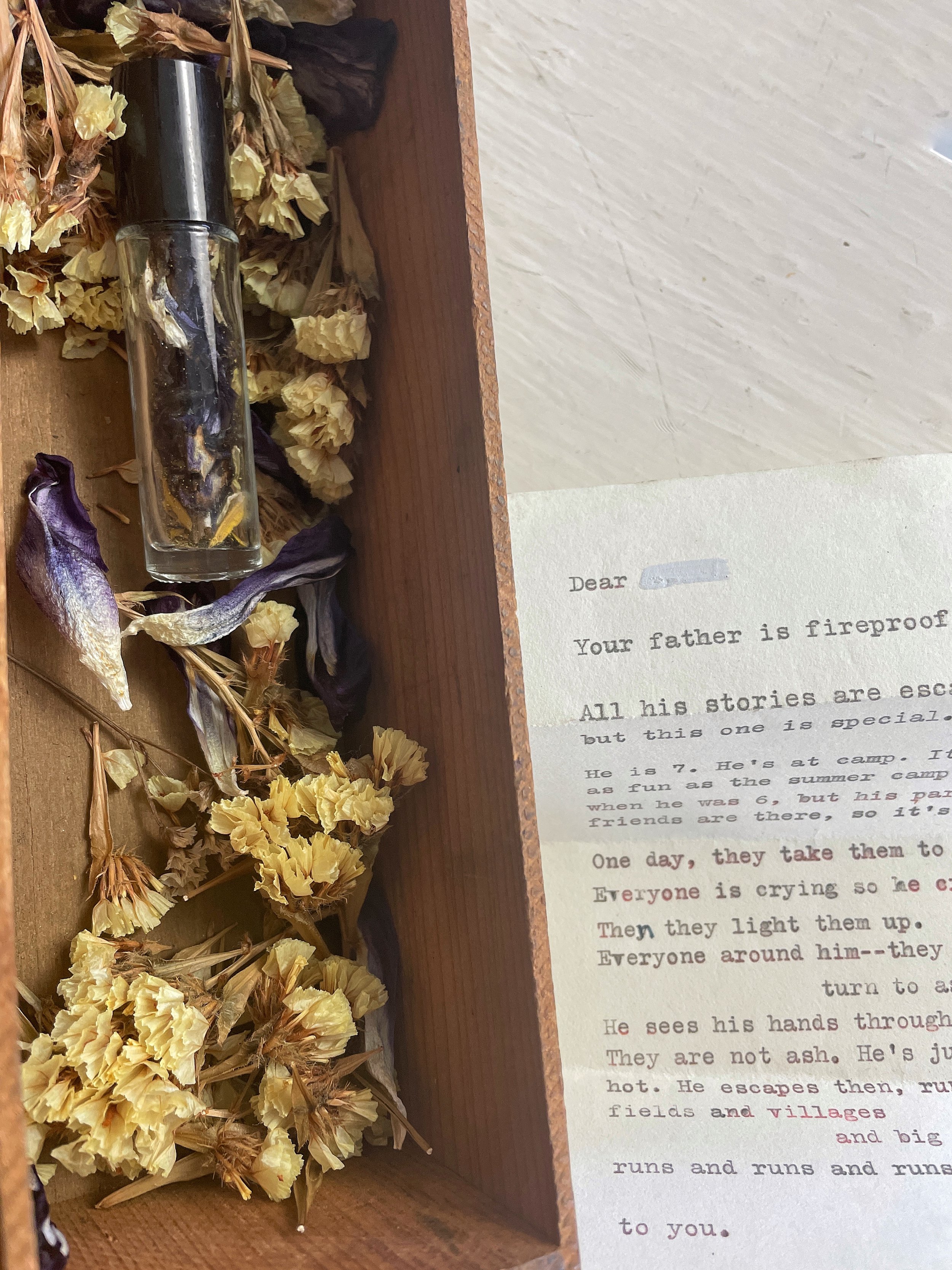 Materials: Primitive tool box Americana circa 1920s, flowers and other organic matter, paper, ink, candy, rocks, a fishing hook, rope, sugar, tea, and feathers.